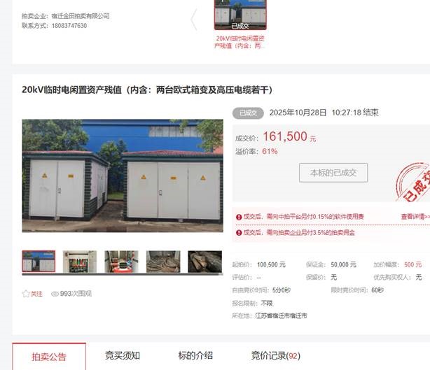 近日,城發(fā)公司青年公寓臨時(shí)電項(xiàng)目一批閑置資產(chǎn)在中拍平臺(tái)公開拍賣,經(jīng)過27分鐘的緊張激烈競價(jià),最終以161500元成交標(biāo)的,比評(píng)估價(jià)100500元高出61000元,溢價(jià)率61%。